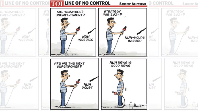 साजिथ कुमार जापान में व्यक्ति द्वारा खुद को कुत्ते में बदलने के लिए हज़ारों डॉलर खर्च करने की हालिया खबर को भारत में राजनेताओं के बीच एक समानता बताते हैं. उन्होंने व्यंग्य करते हुए एक टेलीविजन सेट दिखाया है जिसमें एक चिल्लाता हुआ समाचार एंकर गधे से बंधा हुआ है, जैसे कि संकेत दे रहा हो कि चौथा स्तंभ देश के राजनेताओं की बोली लगा रहा है.