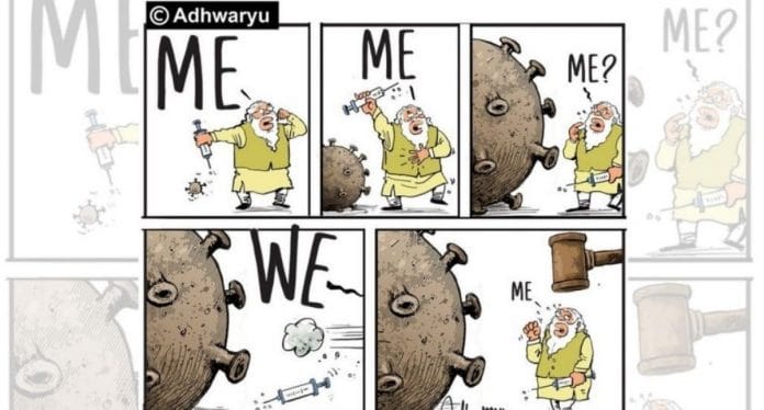 आज के फीचर्ड कार्टून में संदीप अध्वर्यु कोविड को खत्म करने और हाल ही में उनके द्वारा भारत की कोविड पॉलिसी को लेकर यू-टर्न पर कटाक्ष कर रहे हैं संदीप अध्वर्यु.