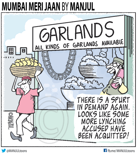 मंजुल अपने चित्र में आर्थिक मंदी, गणेश चतुर्थी उत्सव और हाल ही में बुलंदशहर में इंसपेक्टर की हत्या करने वाले को फूलों की माला पहनाते हुए दिखा रहे हैं.
