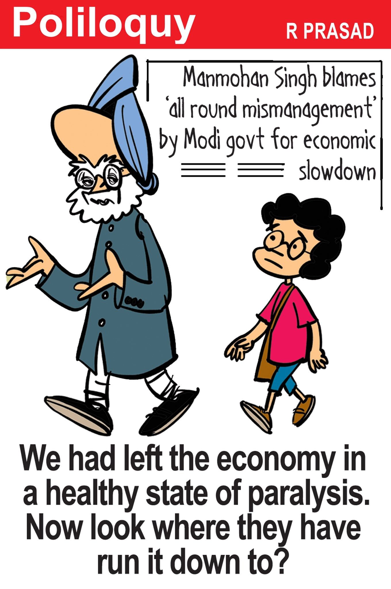 आर प्रसाद पूर्व वित्त मंत्री मनमोहन सिंह के अर्थव्यवस्था की धीमी गति पर दिए बयान पर कार्टून के जरिए कटाक्ष कर रहे हैं. वह कह रहे हैं कि हमलोगों ने भारत की अर्थव्यवस्था को पारालिसिस की स्वस्थ अवस्था में छोड़ा था लेकिन अब देखो अब कहां इसे पहुंचा दिया गया है.