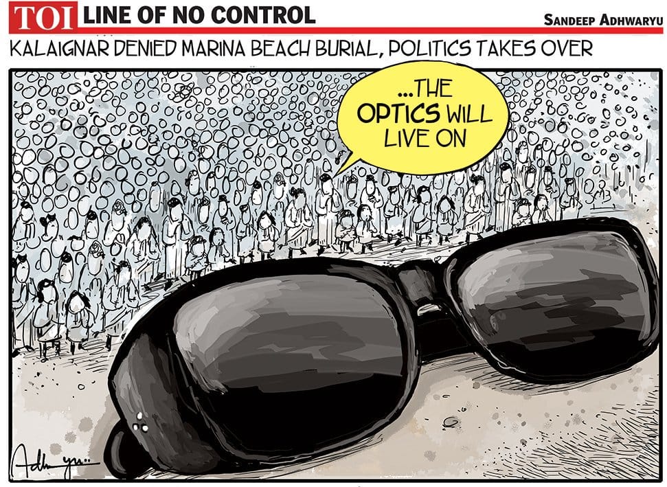 कार्टूनिस्ट संदीप अध्वर्यु डीएमके प्रमुख एम.करुणानिधि के अंतिम संस्कार पर हुए विवाद पर तंज करते हैं। उनके बेटे एमके स्टालिन ने एआईएडीएमके की अगुआई वाली तमिलनाडु सरकार से अनुरोध किया है कि वह चेन्नई के मरीना बीच में कलैगनार को दफनाने दें, उनके सलाहकार अन्ना की समाधि के बगल में। हालांकि, राज्य सरकार ने मंजूरी नहीं दी।