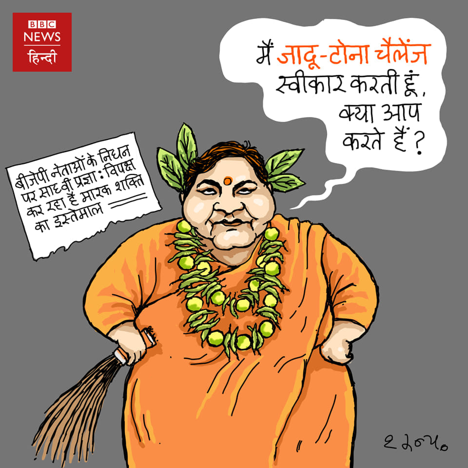 गोपाल शून्य प्रज्ञा सिंह ठाकुर द्वारा विपक्ष को भाजपा नेताओं पर मारक शक्ति का इस्तेमाल करने पर तंज कस रहे हैं.