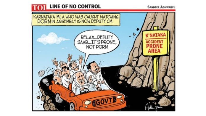 आज के फीचर फोटो में संदीप अध्वर्यु कर्नाटक में 3 डिप्टी सीएम में से एक लक्ष्मण संगप्पा पर तंज कस रहे हैं जिन पर विधानसभा में पॉर्न देखते हुए पकड़े गए थे.