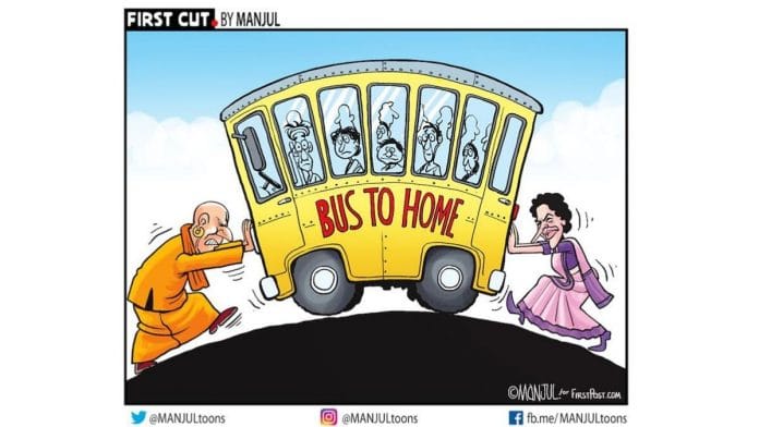 आज के कार्टून में मंजुल दर्शाते हैं कि मज़दूर यूपी सीएम योगी आदित्यनाथ और कांग्रेस महासचिव प्रियंका गांधी वाड्रा की तकरार में फंसे हुए हैं. प्रियंका में योगी को पत्र लिखकर 1000 बसें देने के लिए कहा था, जिससे मज़दूरों को घर पहुंचाया जाना था.