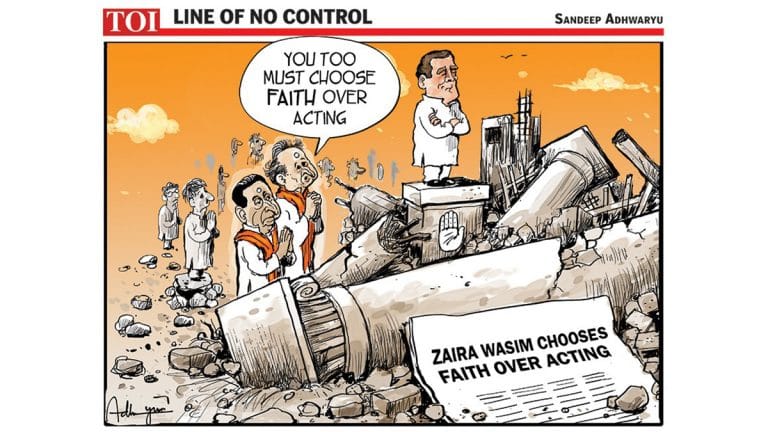 टाइम्स ऑफ इंडिया में संदीप अध्वर्यु ने ’दंगल’ की कलाकार ज़ायरा वसीम को धर्म के नाम पर सिनेमा से अलग होने को दर्शाते हैं और कांग्रेस के वरिष्ठ नेताओं अशोक गहलोत और कमलनाथ को राहुल गांधी से पार्टी नहीं छोड़ने का आग्रह को चित्रित किया है.