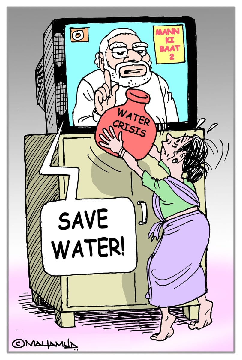महमूद ने अखिल भारतीय रेडियो कार्यक्रम के मन की बात में प्रधानमंत्री नरेंद्र मोदी के ‘पानी बचाने’ की सलाह को दर्शाया है. भारत 45 वर्षों के सबसे गंभीर जल संकट से जूझ रहा है.