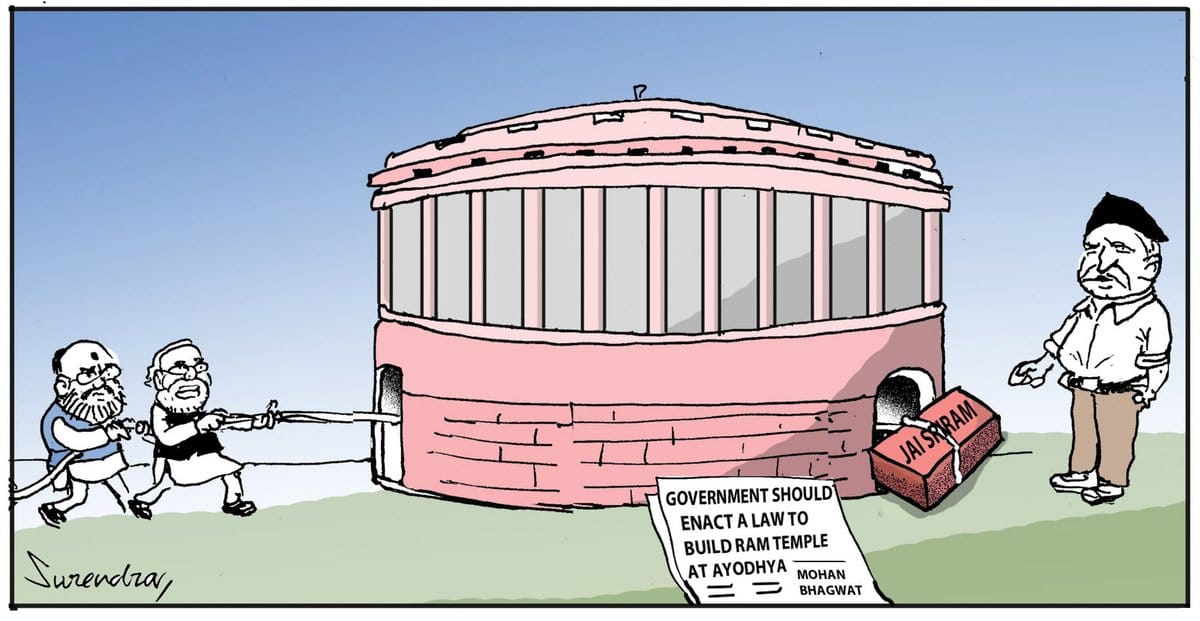 सुरेंद्र दर्शाते हैं कि नरेंद्र मोदी और अमित शाह मोहन भागवत की उस इच्छा को पूरी करने के लिए संघर्ष कर रहे हैं जिसका ज़िक्र मोहन भागवत ने विजयदशमी के भाषण में किया था. राममंदिर की नींव संसद के माध्यम से नहीं डाली जाएगी.