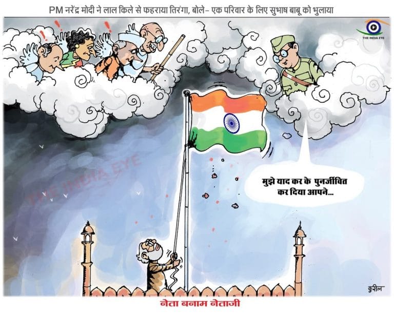 मनोज कुरील सुभाष चंद्र बोस की आजाद हिन्द फ़ौज की 75वी वर्षगांठ पर प्रधानमंत्री के भाषण को दिखाते हैं. वो बोस को भूलने के लिए केवल एक परिवार को ज़िम्मेदार ठहराते है. जबकि कार्टून में दर्शाते है कि बोस प्रधानमंत्री को धन्यवाद दे रहे है कि आपने मुझे याद करके पुनर्जीवित कर दिया है.