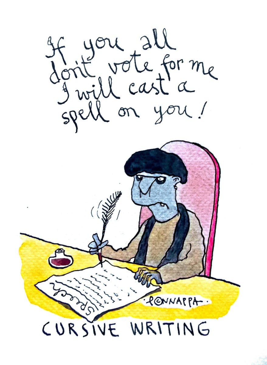 नाला पोनप्पा ‘कर्सिव’ शब्द का मज़ाक उड़ाते हैं. वे बीजेपी सांसद साक्षी महाराज पर चुटकी लेते हैं. महाराज ने मतदाताओं को यह कहकर धमकी दी थी कि अगर उन्होंने उनके लिए वोट नहीं किया तो वे उन्हें श्राप देंगे.