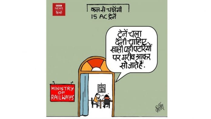 महाराष्ट्र में रेल की पटरियों पर 16 प्रवासियों की जान जाने के बाद आज के अपने प्रदर्शित कार्टून में, कीर्तिश भट्ट एक त्रासदी के तुरंत बाद ट्रेन यात्रा फिर से शुरू करने को लेकर तंज कसते हैं.