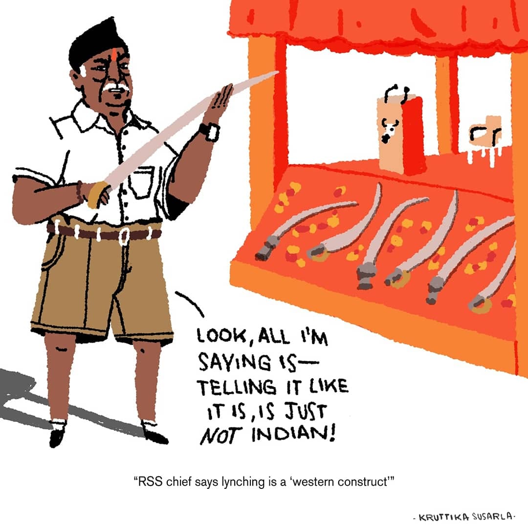 नाला पोनप्पा राष्ट्रीय स्वयंसेवक संघ(आरएसएस) प्रमुख मोहन भागवत की टिप्पणी पर तंज करते है. भागवत ने कहा था कि ‘लिंचिंग’ भारत की परंपरा नहीं है और इस शब्द का इस्तेमाल ‘भारत को बदनाम करने’ के लिए और हिंसा को बढ़ावा देने के लिए किया जा रहा है.