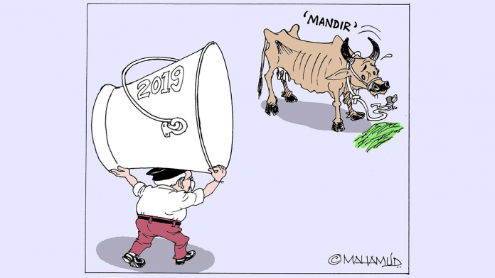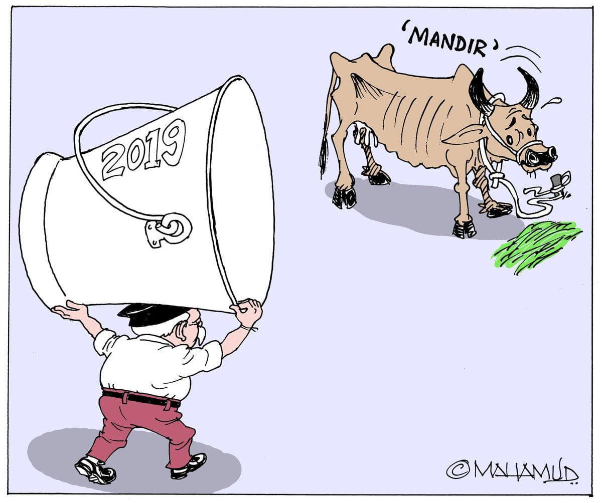 कार्टूनिस्ट महमूद 2019 के चुनाव के लिए आरएसएस प्रमुख मोहन भागवत के द्वारा गाय और मंदिर की राजनीति को हाईलाइट करते हैं.