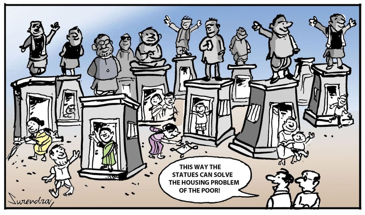 सुरेंद्र सरकार के द्वारा प्रतिमा बनाने के जूनून पर तंज करते हैं और सुझाव देते हैं कि प्रतिमा बनाने से देश में बेघरों की समस्या सुलझ जाएगी.