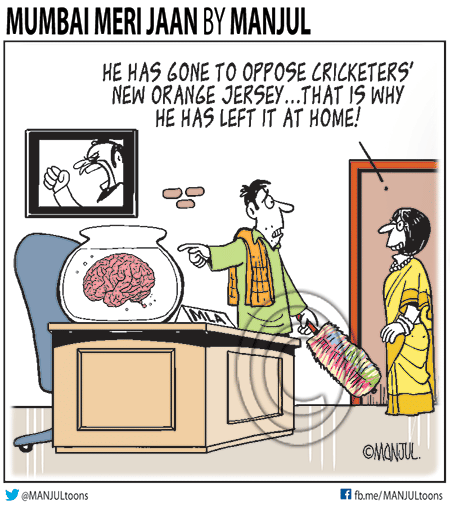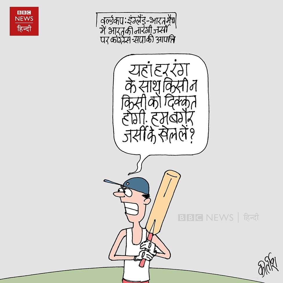 कीर्तीश भट्ट ने विश्व कप में इंग्लैंड के खिलाफ टीम इंडिया की नारंगी जर्सी पर राजनीतिक दलों के बीच नए झगड़े को दर्शाया हैं.