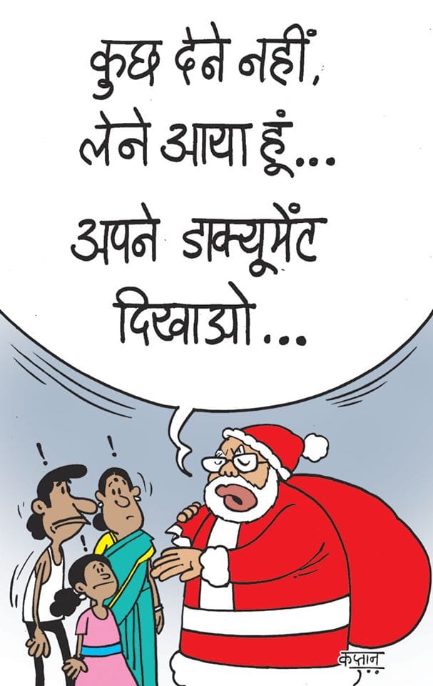आज के फीचर कार्टून में रचिता सीएए-एनआरसी विरोध प्रदर्शन को दर्शाती हैं. विरोध का सामान करने के बाद प्रधानमंत्री नरेंद्र मोदी ने कहा कि एनआरसी की चर्चा हुई ही नहीं. बहुत से लोगों ने प्रधानमंत्री नरेंद्र मोदी, गृहमंत्री अमित शाह समेत मंत्रिमंडल के मंत्रियो को झूठा होने का आरोप लगाया, क्योंकि इन लोगों में पैन इंडिया एनआरसी की बात की थी.