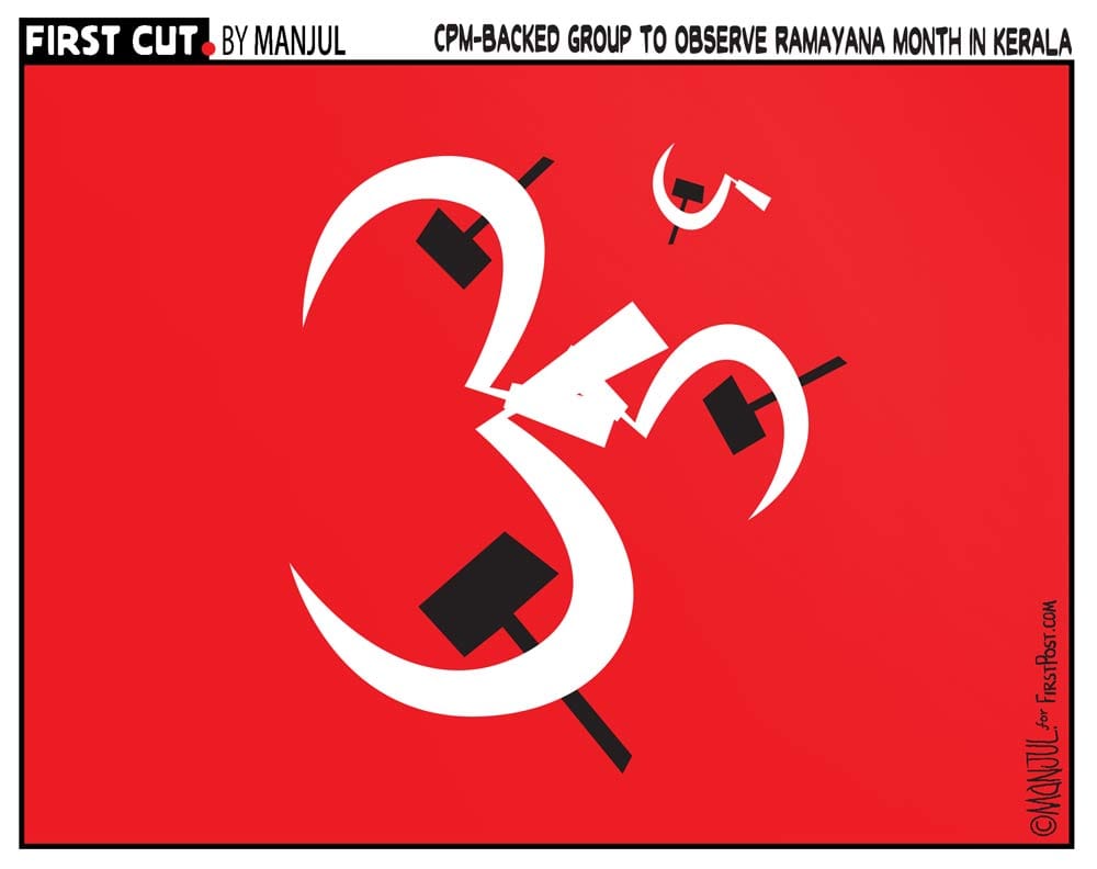 कार्टूनिस्ट मंजुल कम्युनिस्ट पार्टी (मार्क्सवादी) और उसके राज्य केरल में ‘रामायण मासम’ (रामायण का महीना) को देखने के निर्णय पर तंज करते हैं।