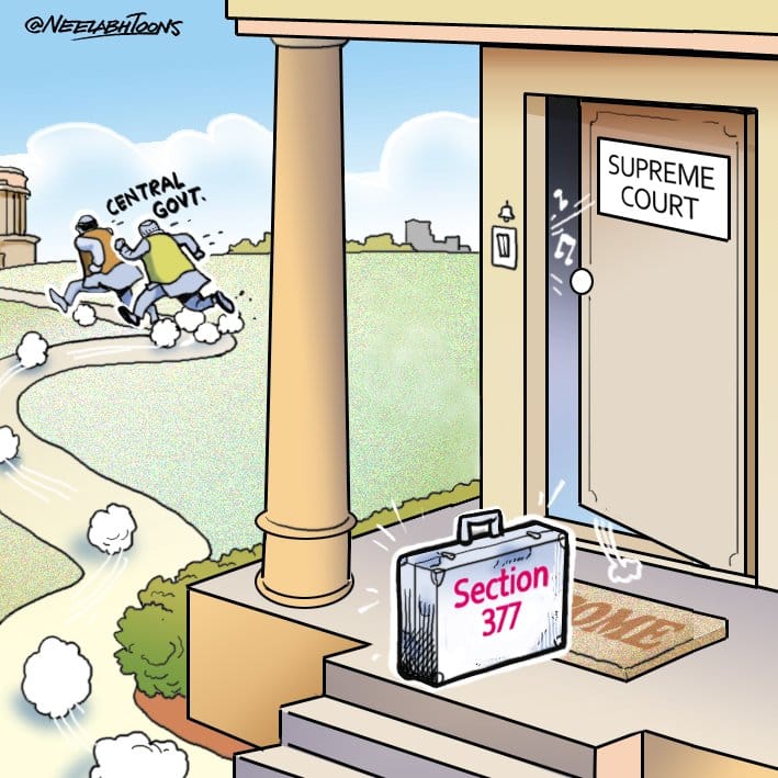 कार्टूनिस्ट नीलभ बनर्जी केंद्र सरकार के द्वारा सुप्रीम कोर्ट के ऊपर धारा 377 का निर्णय लेने और मामले से हाथ अलग करने के लिए केंद्र पर तंज करते हैं।(सेक्शन 377,केंद्र सरकार,सुप्रीम कोर्ट )