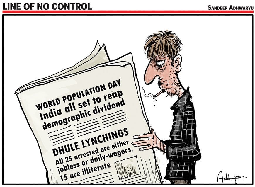 विश्व जनसंख्या दिवस के थीम पर संदीप अध्वर्यु द टाइम्स ऑफ इंडिया में यह वर्णन करते है कि भारत को सच्चाई के विरुद्ध जनसँख्या विभाजन को कम करना चाहिए।( (विश्व जनसंख्या दिवस भारत को जनसँख्या विभाजन को कम करना चाहिए) धुले लिंचिंग -25 लोग जिनको गिरफ्तार किया गया था बेरोजगार थे या तो दैनिक मजदूर ,15 लोग अनपढ़ थे|