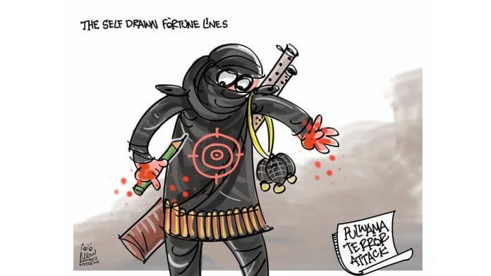 मीका अजीज अपनी बनाई लकीरों में फंसे एक आत्मघाती का चित्रण करते हुए जिसने गुरुवार को पुलवामा में हमला कर 40 सीआरपीएफ जवानों को मार गिराया.