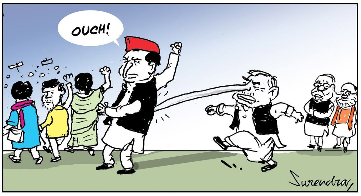 सुरेंद्र मुलायम सिंह यादव द्वारा नरेंद्र मोदी के दोबारा प्रधानमंत्री बनने की इच्छा जताने पर विपक्ष के नेता और समाजवादी पार्टी अध्यक्ष अखिलेश सिंह यादव पर तीखा व्यंग दिखाते हुए.