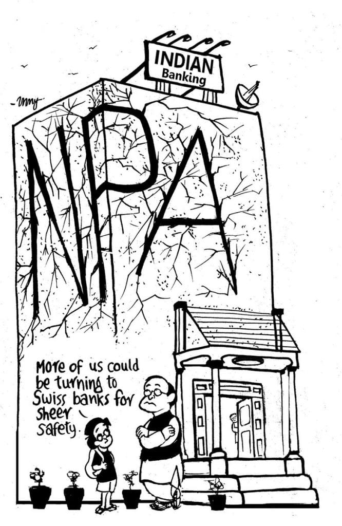 इ .पी.उन्नी ने सुझाव दिया कि नॉन परफार्मिंग एसेट्स के बोझ के साथ भारत का बैंकिंग क्षेत्र, लोगों को स्विस बैंकों में बदलने के लिए मजबूर कर सकता है ।( इस कार्टून के माध्यम से यह कहा गया है गंभीर सुरक्षा के लिए स्विस बैंक की तरफ रुख़ कर सकते है )