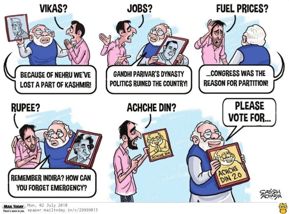 (विकास -नेहरु की वजह से हमने कश्मीर का हिस्सा खो दिया है,रुपया -इंदिरा याद है?, आप आपातकाल कैसे भूल सकते हैं? ,ईंधन की कीमत -कांग्रेस विभाजन का कारण थी,नौकरियां -गांधी परिवार के राजवंश राजनीति ने देश को बर्बाद कर दिया, अच्छे दिन -कृपया वोट दे अच्छे दिन 2.0 के लिए )