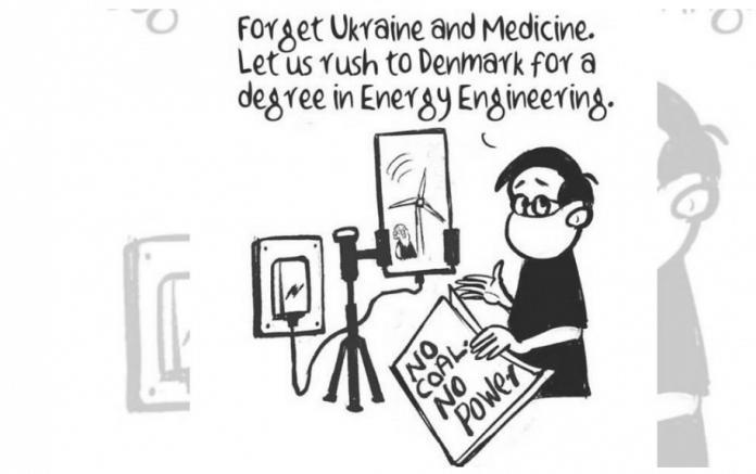 आज के प्रदर्शित कार्टून में, ई.पी. उन्नी ने प्रधानमंत्री नरेंद्र मोदी की यूरोप यात्रा, जो की अक्षय ऊर्जा के लिए जाने जाते हैं पर तंज कसा है, ऐसे समय में जब राज्य बिजली संकट और कोयले की कमी से जूझ रहे हैं.