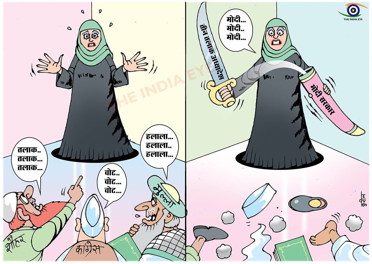 राष्ट्रपति राम नाथ कोविंद के द्वारा ट्रिपल तालक के अध्यादेश पर हस्ताक्षर किए जाने के बाद मनोज कुरील अपने कार्टून में एक ऐसी स्थिति की कल्पना करते है जहां एक मुस्लिम महिला अपने तीनों डर(हलाला,वोट,तीन तलाक़ ) से सामना करने के लिए नरेंद्र मोदी और उनकी सरकार को धन्यवाद देती है.