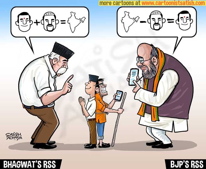 सतीश आचार्य ने भागवत की टिप्पणियों पर कटाक्ष किया है. लेकिन उनके अनुसार, भागवत केवल परदा डाल रहे है जबकि ‘असली’, आरएसएस का हिंसक चेहरा भाजपा अध्यक्ष अमित शाह के द्वारा बताया जा रहा की ‘भारत में से मुसलमान कम कर दो वो हिंदू राष्ट्र के बराबर हैं’.