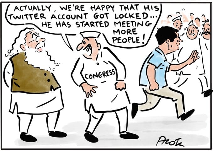 आज के फीचर कार्टून में सतीश आचार्य कांग्रेस के आरोपों पर तंज करते हैं कि राहुल गांधी सहित पार्टी के 23 वरिष्ठ नेताओं के ट्विटर अकाउंट और सात आधिकारिक पार्टी हैंडल ‘सरकार के दबाव’ के कारण बंद कर दिए गए थे.