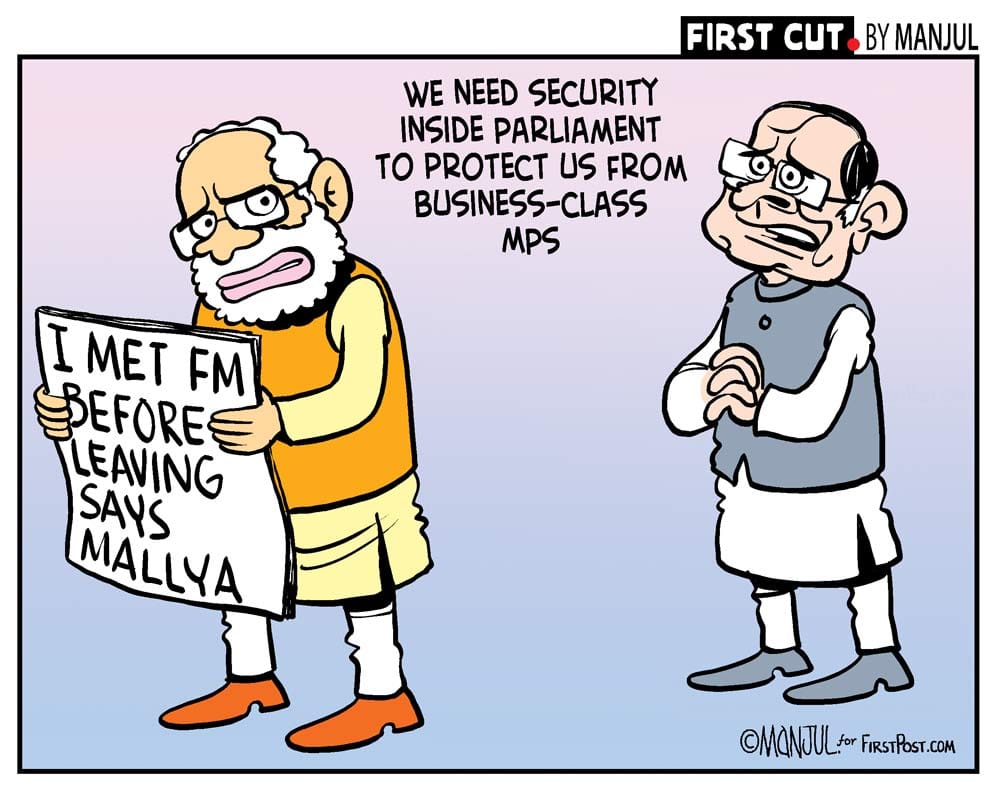 मंजुल ने कार्टून के माध्यम से तंज किया है. विजय माल्या का दावा है कि वह भारत छोड़ने से पहले वित्त मंत्री अरुण जेटली से मिले थे.