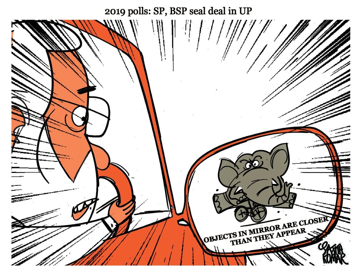 कार्टूनिस्ट महमूद सपा-बसपा के नए गठबंधन को बीजेपी की राह में रोड़ा देखते हैं और उन्हें लगता है कि हाथी (बसपा का चुनाव चिन्ह) पर सवार सपा इस बार मोदी-शाह-योगी की तिकड़ी पर भारी पड़ेगा.