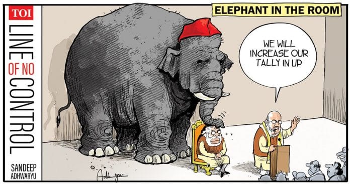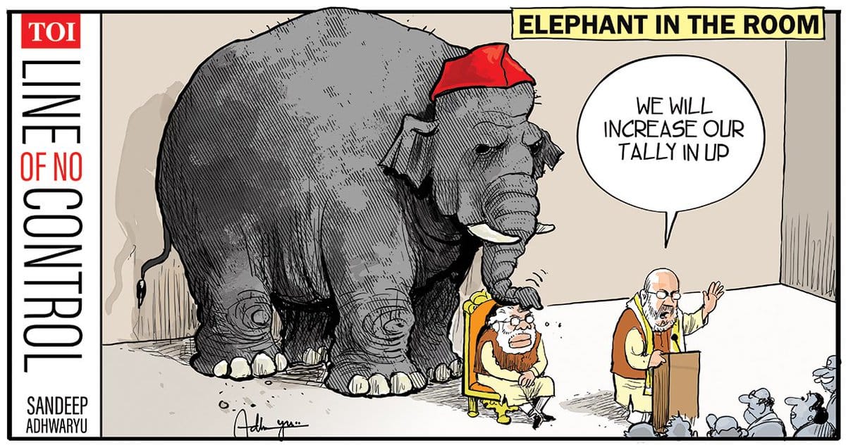 संदीप अध्वर्यु ने टाइम्स ऑफ इंडिया में सुझाया है कि सपा और बसपा का गठबंधन ऐसा प्रतीत हो रहा जैसे एक कमरे में बंद हाथी ने भाजपा के सीटों के बढ़ने के दावे पर अपनी छाया डाल दी हो.