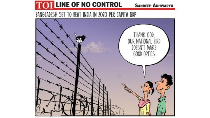 आज के फीचर कार्टून में संदीप अध्वर्यू आईएमएफ के हालिया अनुमान को दर्शा रहे हैं जिसमें बताया गया है कि बांग्लादेश की प्रति व्यक्ति जीडीपी भारत से आगे निकल सकती है.