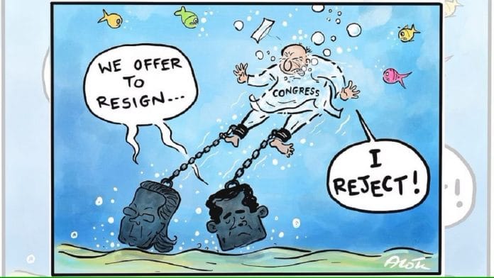 आज के विशेष रूप से प्रदर्शित कार्टून में, आलोक निरंतर ने विधानसभा चुनावों में एक और पराजय के बाद कार्यसमिति की बैठक में सोनिया और राहुल गांधी के नेतृत्व में कांग्रेस द्वारा व्यक्त किए गए सर्वसम्मत विश्वास का मजाक उड़ाया है. निरंतर की कल्पना में, एक डूबते हुए कांग्रेसी नेता के जोरदार विरोध पर, मां-बेटे (सोनिया-राहुल) की जोड़ी पार्टी को नीचे की ओर खींच रही है, इस्तीफा देने की पेशकश करती है.