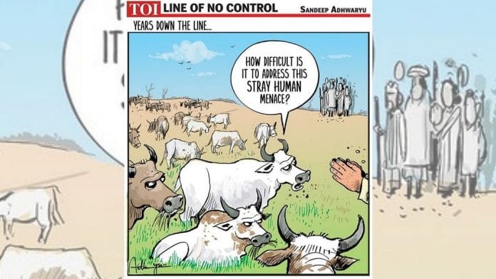 आज के विशेष रूप से प्रदर्शित कार्टून में, संदीप अध्वर्यु ने आवारा मवेशियों के खतरे का उल्लेख किया है, जो उत्तर प्रदेश में एक प्रमुख चुनावी मुद्दा है. 2017 में योगी आदित्यनाथ सरकार द्वारा गोहत्या पर प्रतिबंध लगाने के बाद से किसानों ने ऐसे मवेशियों से फसल के नुकसान की बढ़-चढ़कर शिकायत की है. हाल ही में एक चुनावी रैली में, पीएम मोदी ने भाजपा के सत्ता में वापस आने पर इसके समाधान का वादा किया है. अध्वर्यु इस मुद्दे को मवेशियों के नजरिए से देखते हैं, जो (मवेशी) इंसानों को भी एक ‘खतरे’ के रूप में देखते हैं.