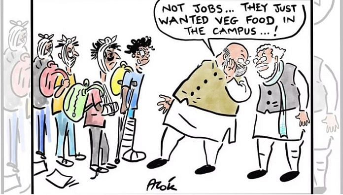 आज के विशेष रूप से प्रदर्शित कार्टून में, कथित तौर पर एक छात्रावास के मेस में मांसाहारी भोजन परोसने पर, आलोक निरंतर नई दिल्ली के जवाहरलाल नेहरू विश्वविद्यालय परिसर में दक्षिणपंथी और वामपंथी छात्र संघों के बीच हिंसा की ओर इशारा करते हैं.