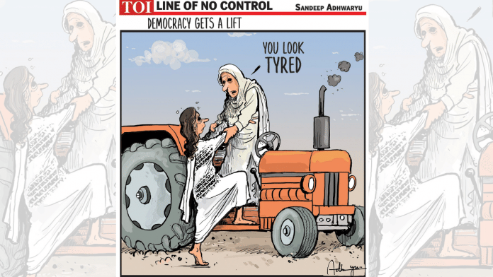 आज के फीचर कार्टून में संदीप अध्वर्यु ने एक महिला किसान को लोकतंत्र को लिफ्ट देते हुए दिखाया है जिसके जरिए एक साल के विरोध के बाद मोदी सरकार के कृषि कानूनों को निरस्त करने की तरफ इशारा किया गया है. टायर के निशान को लखीमपुर खीरी की घटना के प्रतीक के तौर पर दिखाया है.