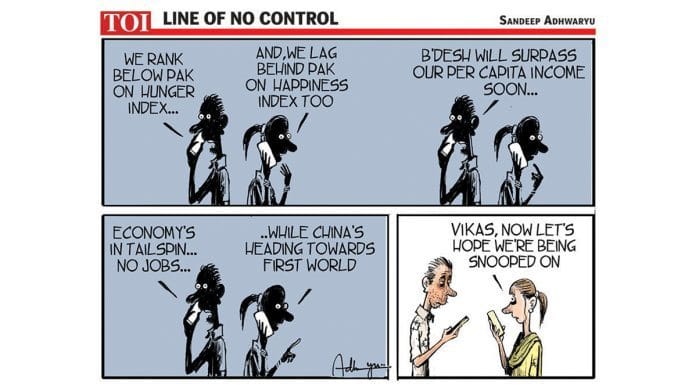 आज के फीचर कार्टून में संदीप अध्वर्यु मौजूदा आर्थिक स्थिति पर निशाना साध रहे हैं. भारत की वैश्विक हंगर इंडेक्स में खराब स्थिति और कमजोर जीडीपी के साथ हाल ही में व्हाट्सएप द्वारा बताया गया कि भारतीय पत्रकारों और एक्टिविस्टों की जासूसी की गई है.
