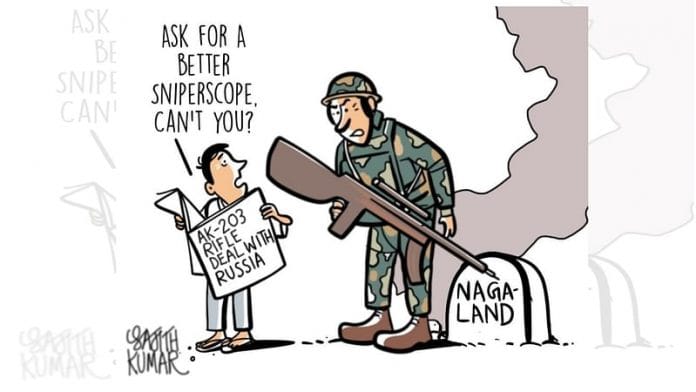 आज के फीचर्ड कार्टून में सजिथ कुमार उत्तर प्रदेश में भारत और रूस के बीच AK-203 राइफल्स बनाने की डील को नागालैंड में मारे गए नागरिकों से जोड़ कर देख रहे हैं.