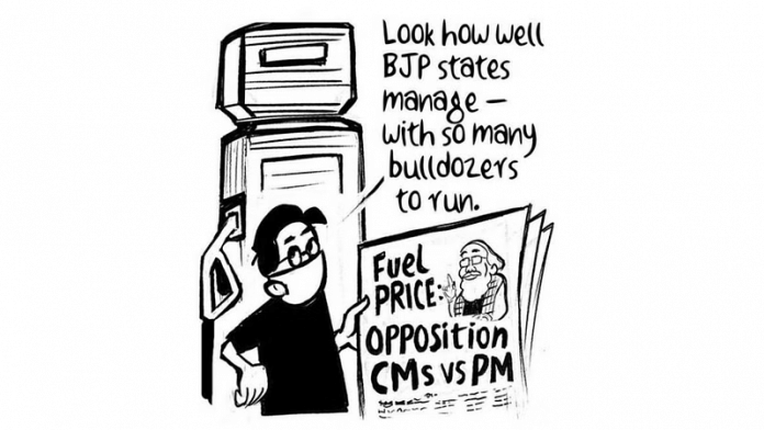 आज के फीचर कार्टून में ईपी उन्नी भाजपा सरकारों समेत केंद्र सरकार पर दो मुद्दों को लेकर निशाना साध रहे हैं. पहला मुद्दा है ईंधन की बढ़ती कीमतें और दूसरा है ‘अवैध निर्माण’ को ध्वस्त करना.