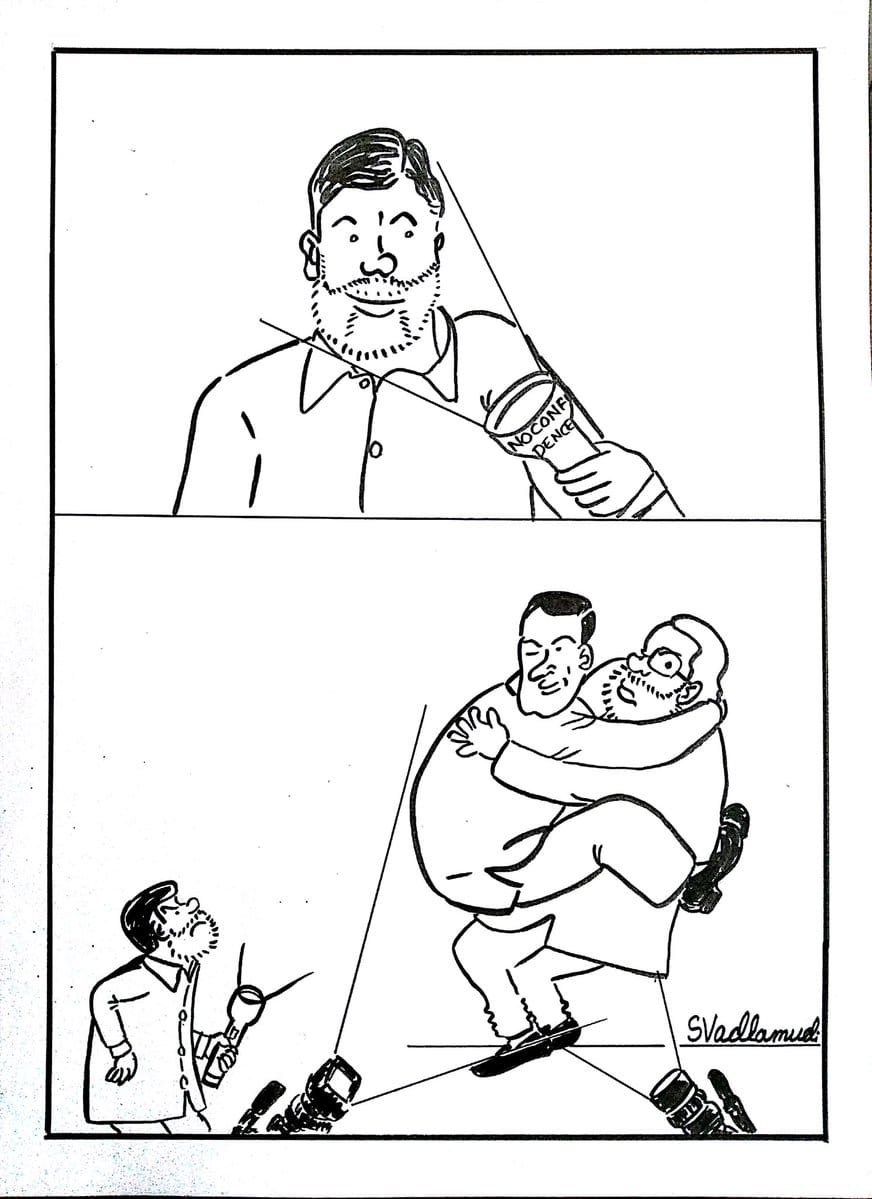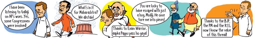 कार्टूनिस्ट स्वाति वदलामुडी ने यह दर्शाया है कि कैसे गले मिलने की प्रक्रिया ने टीडीपी की अगुवाई में अविश्वास प्रस्ताव पर सभी चर्चाओं पर डाका डाल दिया जो की आंध्र प्रदेश को विशेष दर्ज़ा देने से इनकार करने के खिलाफ विरोध करना चाहते थे।(अविश्वास प्रस्ताव )