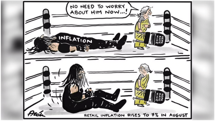 आज के विशेष रूप से प्रदर्शित कार्टून में, आलोक निरंतर मुद्रास्फीति को नियंत्रित करने के लिए अगस्त में रेपो दर को 50 आधार अंक बढ़ाकर 5.40 प्रतिशत करने के केंद्र के फैसले पर कटाक्ष करते हैं. रेपो दर, वास्तव में, पिछले चार महीनों में तीन बार बढ़ाई गई. 12 सितंबर को, खुदरा मुद्रास्फीति जुलाई में 6.71 प्रतिशत से बढ़कर अगस्त में 7 प्रतिशत हो गई, जिसका मुख्य कारण खाद्य पदार्थों की ऊंची कीमतें थीं.