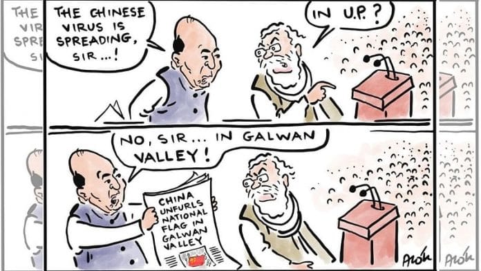 आज के फीचर कार्टून में आलोक निरंतर ने पीएम नरेंद्र मोदी की गलवान घाटी में चीन की बढ़ती पकड़ को लेकर आलोचना की है. वो कार्टून के जरिए बताने की कोशिश कर रहे हैं कि सरकार का ध्यान उत्तर प्रदेश पर है जहां बढ़ते कोविड -19 मामलों के बीच राजनीतिक रैलियों में हिस्सा लेने के लिए हजारों लोग पहुंच रहे हैं.