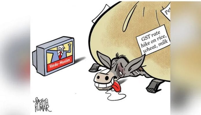आज के विशेष रूप से प्रदर्शित कार्टून में, साजिथ कुमार ने वस्तुओं और सेवा कर (जीएसटी) की बढ़ोत्तरी से घरों पर पड़ने वाले बोझ पर टिप्पणी की है, जबकि मीडिया सांप्रदायिक मुद्दों पर ध्यान केंद्रित कर रहा है. 5 प्रतिशत जीएसटी वृद्धि सोमवार से लागू होने के साथ, अनाज, दाल और आटा जैसे पहले से पैक और लेबल वाले खाद्य पदार्थ महंगे हो जाएंगे.