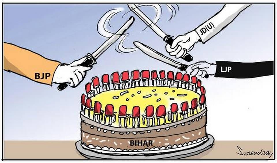 द हिंदू में सुरेंद्र ने बिहार में सहयोगी भाजपा, एलजेपी और जेडी (यू) के बीच संभावित सीट साझा करने की बातचीत पर अपना रुख कार्टून के माध्यम से दिखाया है।