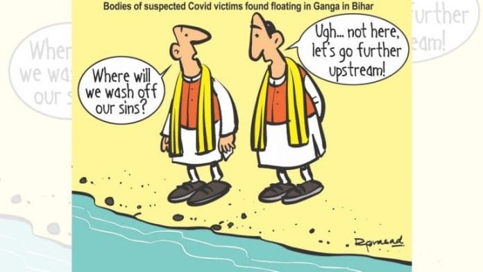 आज के फीचर कार्टून में आर प्रसाद दर्शाते है कि किस प्रकार से बिहार में कोविड-19 से हुई मौतों की करीब 100 लाश गंगा नदी में मिली.