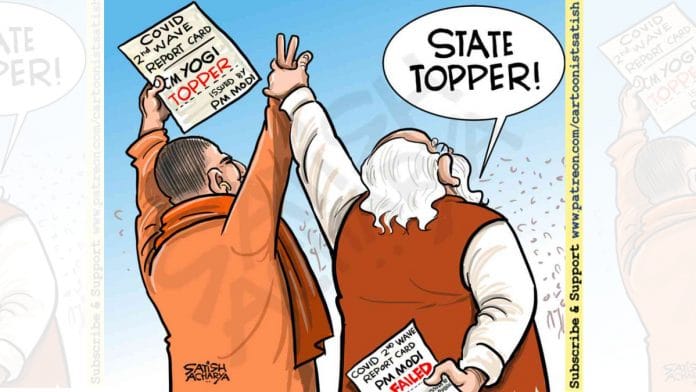 आज के फीचर कार्टून में सतीश आचार्य पीएम नरेंद्र मोदी पर निशाना साध रहे हैं. मोदी ने योगी आदित्यनाथ की तारीफ करते हुए कहा था कि उन्होंने यूपी में ‘कोविड की दूसरी लहर को अच्छी तरह से संभाला’.