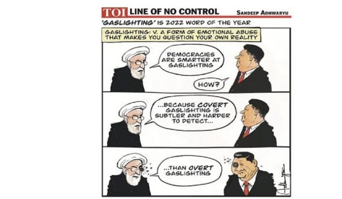 आज के प्रदर्शित कार्टून में, संदीप अध्वर्यु मरियम-वेबस्टर के 2022 के शब्द, गैसलाइटिंग – ‘विशेष रूप से अपने स्वयं के लाभ के लिए किसी को गुमराह करने का कार्य या अभ्यास’ पर आकर्षित करते हैं – चीन और ईरान में सरकारें किस तरह अपने-अपने देशों में विरोध प्रदर्शनों को दबाने में लगी हैं.