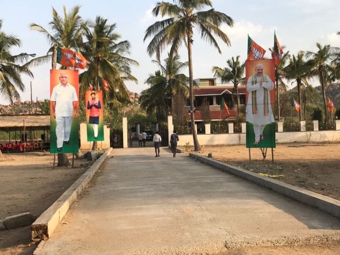 रास्ते पर कुछ सौ मीटर चलने के बाद यह कड़क सूखा रास्ता दाईं ओर हरियाली में बदल जाता है। सबसे जरूरी बात तो यह है कि यहाँ पर आपको वह जगह मिलती है जो आप मिस कर रहे हैं– होर्डिंग्स और कट-आउट। जो आपके सामने एकटक देख रहे हैं वह हैं भाजपा के मुख्यमंत्री पद के उम्मीदवार बी. एस. येदियुरप्पा और साथ में हैं अमित शाह। अमित शाह उस “फार्महाउस” के निवासी से किसी भी प्रकार की संगति करने से बचते रहे हैं, कोई बात नहीं । इन दोनों के पीछे के पीछे ताकतवर तेलुगू फिल्म स्टार की तरह फ्रेम में श्रीरामुलू हैं,जो बादामी में वर्तमान मुख्यमंत्री सिद्धारमैया के खिलाफ भाजपा के उम्मीदवार हैं।बादामी यहाँ से करीब चार घंटे की दूरी पर है। इस घर के दो बहुत रौबदार भाई इन चुनावों में भाग ले रहे हैं। लेकिन आप देख सकते हैं कि दशकों से उनका सबसे अच्छा दोस्त ही उनका पसंदीदा व्यक्ति है।